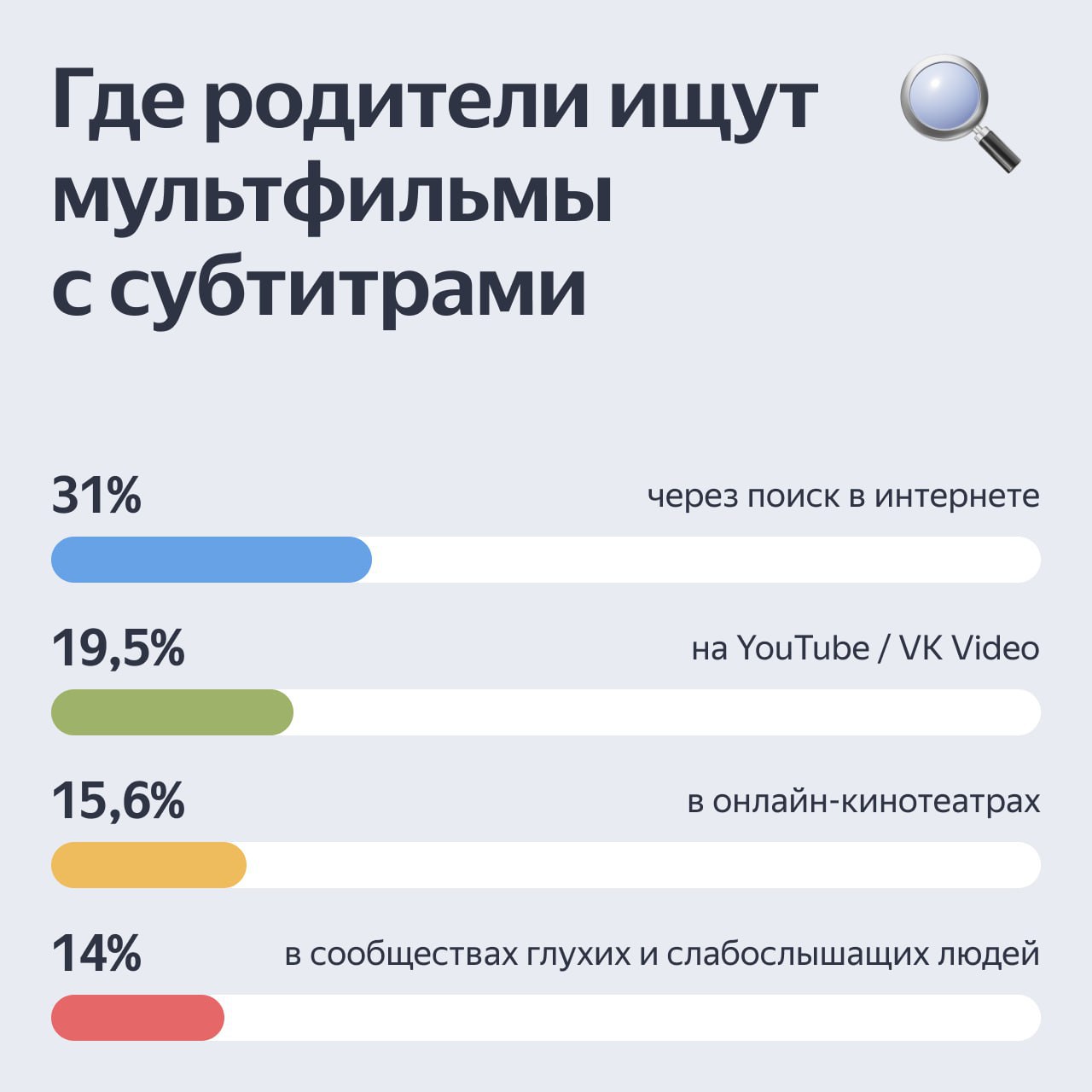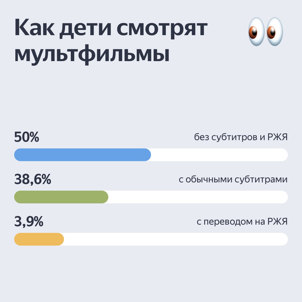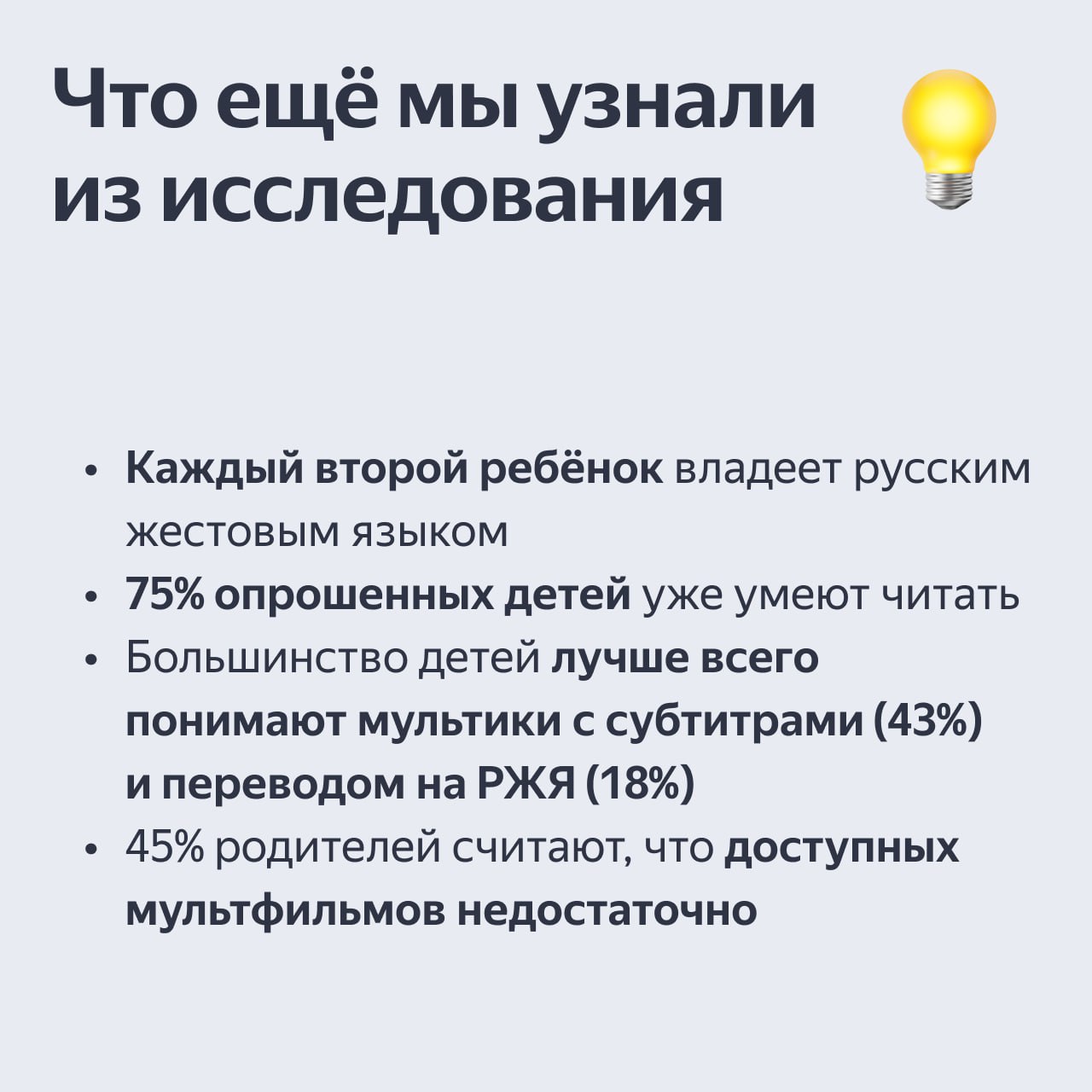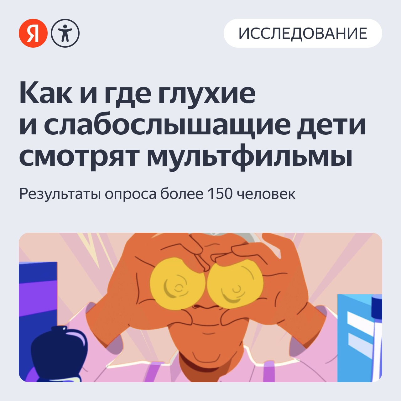 Субтитры — лучший способ понять сюжет мультфильма. Но 50% глухих детей смотрят мультики без адаптации. Мы узнали у родителей детей с особенностями слуха, как и где они находят детский контент. Опрос прошли более 150 человек, а помогли нам в организации исследования Учебный центр ВОГ https://t.me/umcvog, «Я тебя слышу» https://t.me/I_Hear_You_Life и «Глухих.нет» https://t.me/gluxixnet.